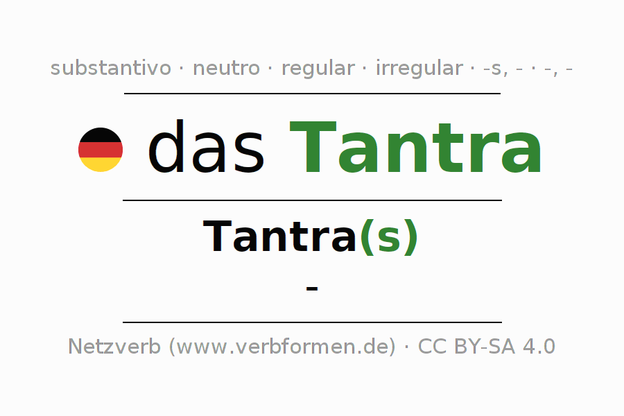A declinação do substantivo Tantra está no genitivo singular Tantra(s) e no nominativo plural - . O substantivo forte Tantra é declinado com a terminação s/-/-. Não há formas no plural. O gênero gramatical de Tantra é neutro e o artigo definido é "das". Não se pode somente declinar o substantivo Tantra mas sim todos os substantivos em alemão. Comentários ☆