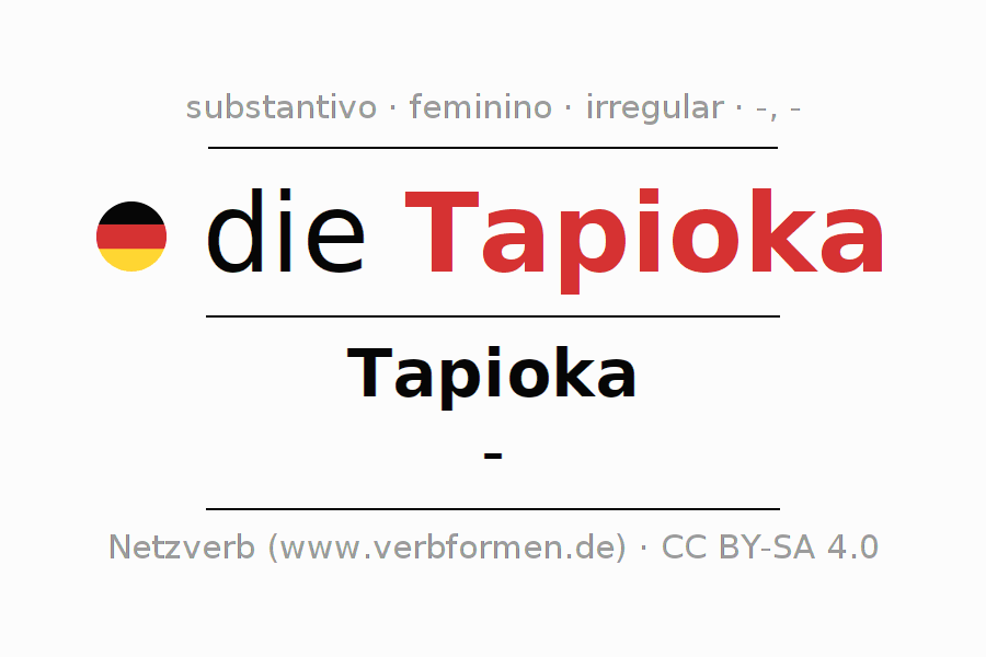 A declinação do substantivo Tapioka (tapioca, polvilho) está no genitivo singular Tapioka e no nominativo plural - . O substantivo Tapioka é declinado com as terminações -/-. Não há formas no plural. O gênero gramatical de Tapioka é feminino e o artigo definido é "die". Não se pode somente declinar o substantivo Tapioka mas sim todos os substantivos em alemão. Comentários ☆