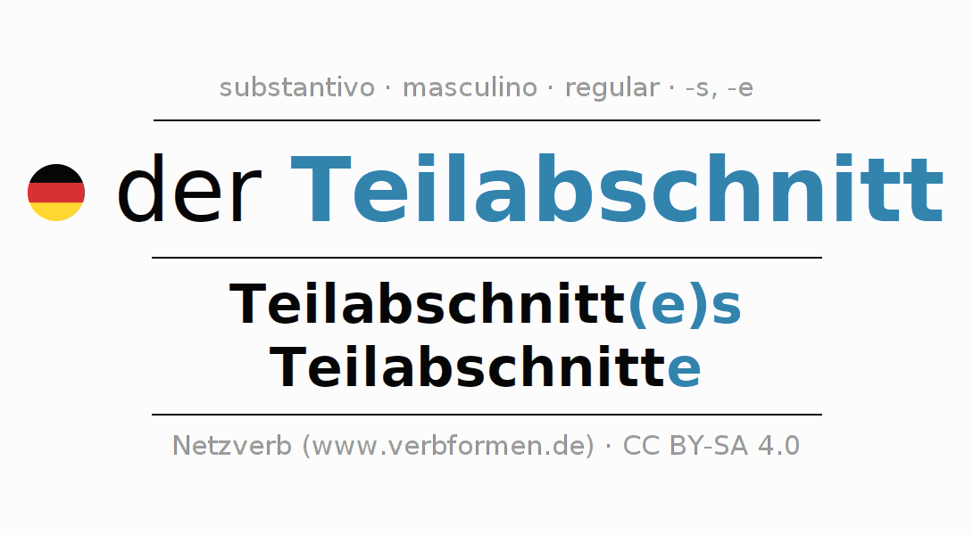 A declinação do substantivo Teilabschnitt (parte, seção) está no genitivo singular Teilabschnitt(e)s e no nominativo plural Teilabschnitte . O substantivo forte Teilabschnitt é declinado com a terminação es/e. O gênero gramatical de Teilabschnitt é masculino e o artigo definido é 'der'. Não se pode somente declinar o substantivo Teilabschnitt mas sim todos os substantivos em alemão. Comentários ☆