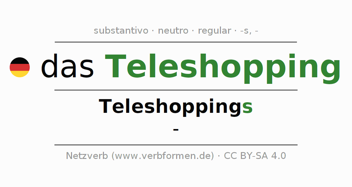 A declinação do substantivo Teleshopping (compras na televisão, televendas) está no genitivo singular Teleshoppings e no nominativo plural - . O substantivo forte Teleshopping é declinado com a terminação s/-. Não há formas no plural. O gênero gramatical de Teleshopping é neutro e o artigo definido é "das". Não se pode somente declinar o substantivo Teleshopping mas sim todos os substantivos em alemão. Comentários ☆