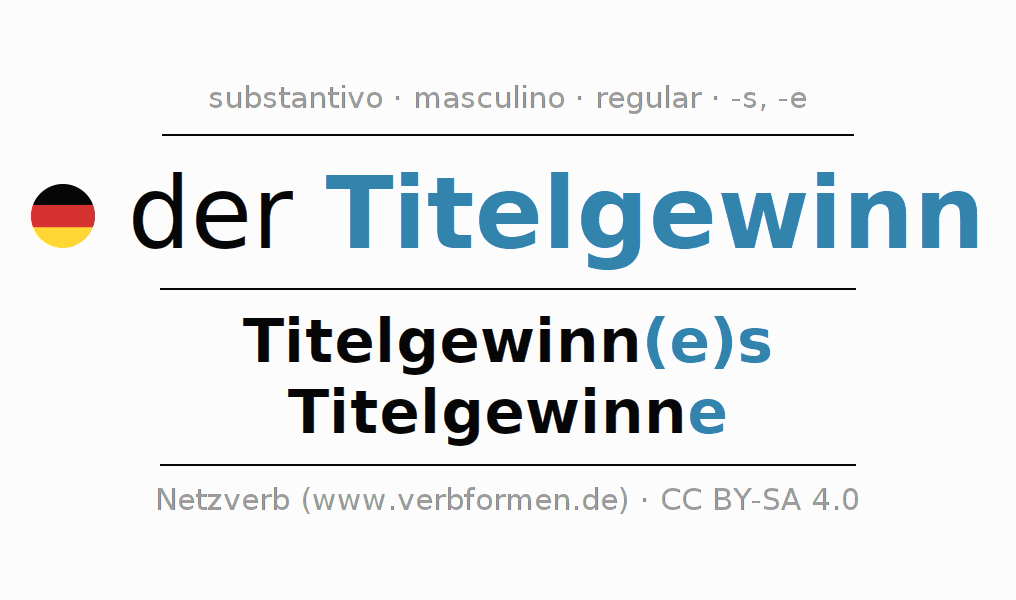 A declinação do substantivo Titelgewinn (conquista de título, título) está no genitivo singular Titelgewinn(e)s e no nominativo plural Titelgewinne . O substantivo forte Titelgewinn é declinado com a terminação es/e. O gênero gramatical de Titelgewinn é masculino e o artigo definido é 'der'. Não se pode somente declinar o substantivo Titelgewinn mas sim todos os substantivos em alemão. Comentários ☆