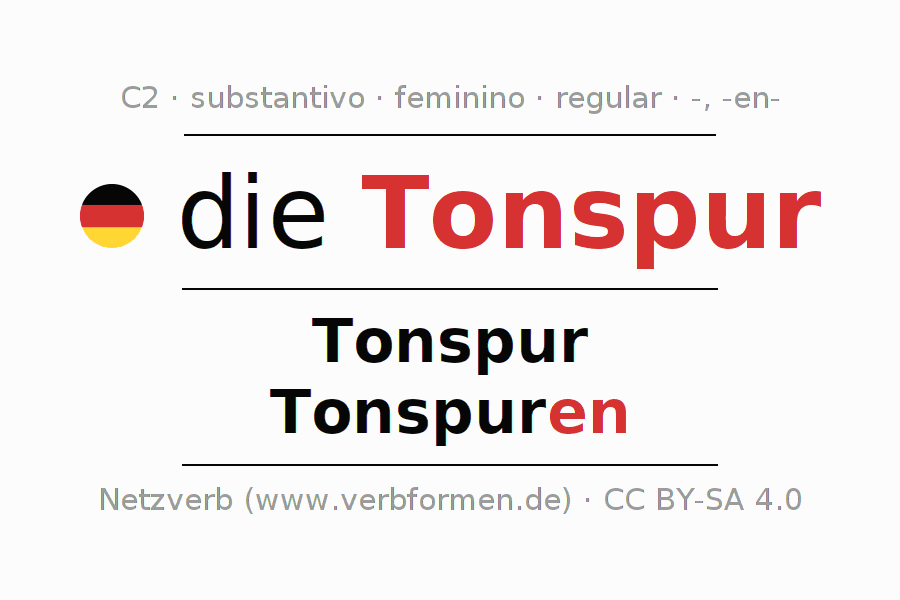 Declinação de Tonspur é apresentada em uma tabela com todas as formas no singular e no plural (plural) e em todos os quatro casos: nominativo (1º caso), genitivo (2º caso), dativo (3º caso) e acusativo (4º caso) . Especialmente para os alunos de alemão, a correta declinação da palavra Tonspur é fundamental.