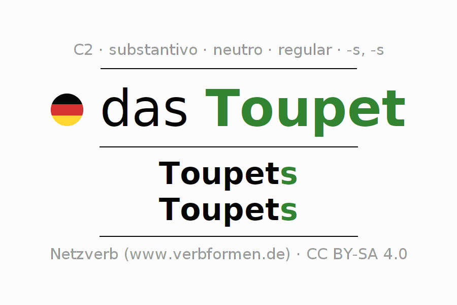 Declinação de Toupet é apresentada em uma tabela com todas as formas no singular e no plural (plural) e em todos os quatro casos: nominativo (1º caso), genitivo (2º caso), dativo (3º caso) e acusativo (4º caso) . Especialmente para os alunos de alemão, a correta declinação da palavra Toupet é fundamental.