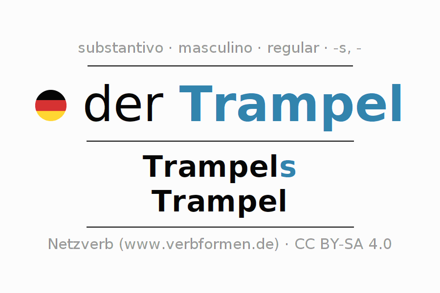 A declinação do substantivo Trampel (desajeitado, desastrada) está no genitivo singular Trampels e no nominativo plural Trampel . O substantivo forte Trampel é declinado com a terminação s/-. O gênero gramatical de Trampel é masculino e o artigo definido é 'der'. O substantivo também pode ser usado com outros géneros e outros artigos. Não se pode somente declinar o substantivo Trampel mas sim todos os substantivos em alemão. Comentários ☆