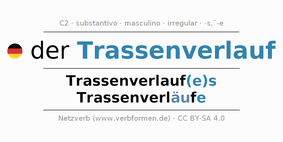- Plural: die Trassenverläufe, der Trassenverläufe, den Trassenverläufen, die Trassenverläufe