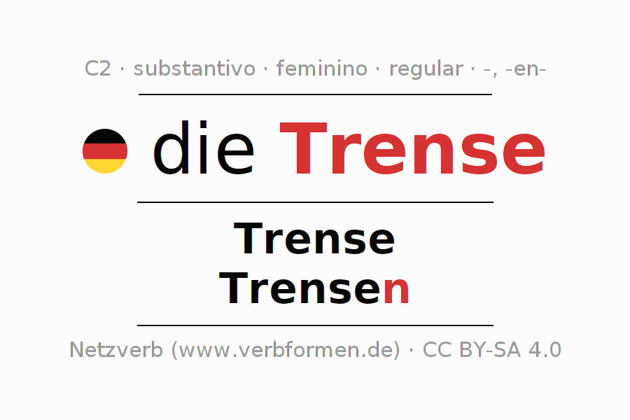 Declinação de Trense é apresentada em uma tabela com todas as formas no singular e no plural (plural) e em todos os quatro casos: nominativo (1º caso), genitivo (2º caso), dativo (3º caso) e acusativo (4º caso) . Especialmente para os alunos de alemão, a correta declinação da palavra Trense é fundamental.