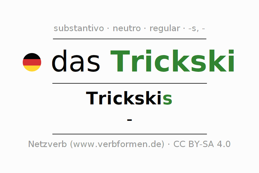 A declinação do substantivo Trickski (ski de figuras) está no genitivo singular Trickskis e no nominativo plural - . O substantivo forte Trickski é declinado com a terminação s/-. Mas pode também ser usado para outros fins. Não há formas no plural. O gênero gramatical de Trickski é neutro e o artigo definido é "das". O substantivo também pode ser usado com outros géneros e outros artigos. Não se pode somente declinar o substantivo Trickski mas sim todos os substantivos em alemão. Comentários ☆