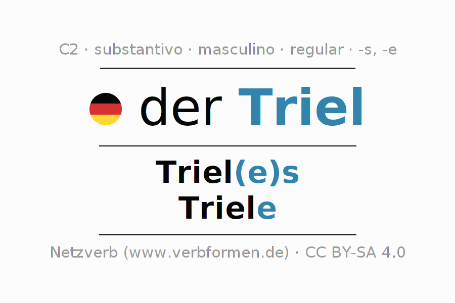 Declinação de Triel é apresentada em uma tabela com todas as formas no singular e no plural (plural) e em todos os quatro casos: nominativo (1º caso), genitivo (2º caso), dativo (3º caso) e acusativo (4º caso) . Especialmente para os alunos de alemão, a correta declinação da palavra Triel é fundamental.