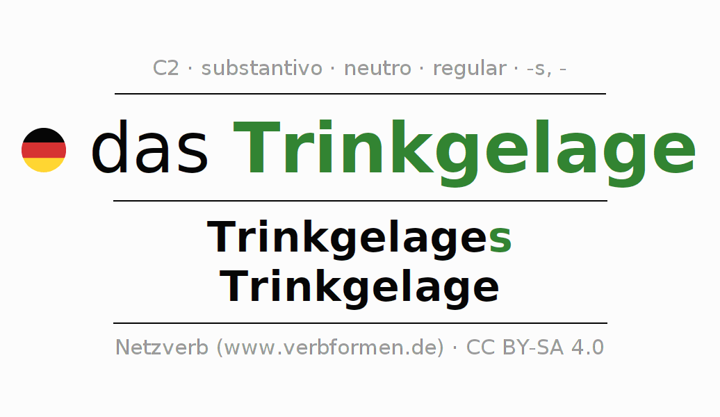 Declinação de Trinkgelage é apresentada em uma tabela com todas as formas no singular e no plural (plural) e em todos os quatro casos: nominativo (1º caso), genitivo (2º caso), dativo (3º caso) e acusativo (4º caso) . Especialmente para os alunos de alemão, a correta declinação da palavra Trinkgelage é fundamental.