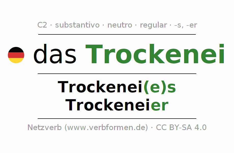 Declinação de Trockenei é apresentada em uma tabela com todas as formas no singular e no plural (plural) e em todos os quatro casos: nominativo (1º caso), genitivo (2º caso), dativo (3º caso) e acusativo (4º caso) . Especialmente para os alunos de alemão, a correta declinação da palavra Trockenei é fundamental.