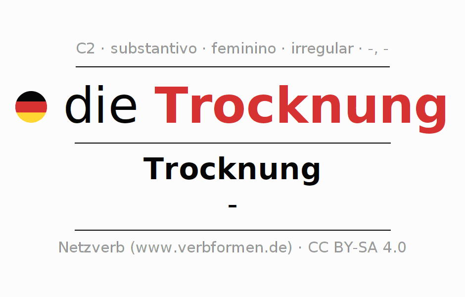 A declinação do substantivo Trocknung (secagem, desidratação) está no genitivo singular Trocknung e no nominativo plural - . O substantivo Trocknung é declinado com as terminações -/-. Não há formas no plural. O gênero gramatical de Trocknung é feminino e o artigo definido é "die". Não se pode somente declinar o substantivo Trocknung mas sim todos os substantivos em alemão. O substantivo faz parte do vocabulário referente ao Certificado em Alemão do Nível C2. Comentários ☆