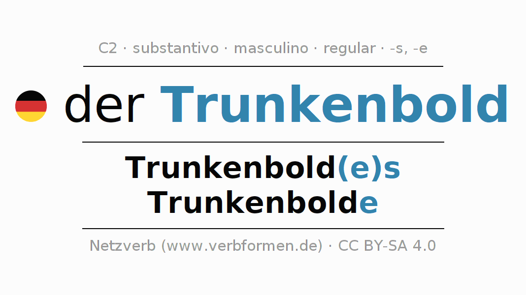 Declinação de Trunkenbold é apresentada em uma tabela com todas as formas no singular e no plural (plural) e em todos os quatro casos: nominativo (1º caso), genitivo (2º caso), dativo (3º caso) e acusativo (4º caso) . Especialmente para os alunos de alemão, a correta declinação da palavra Trunkenbold é fundamental.