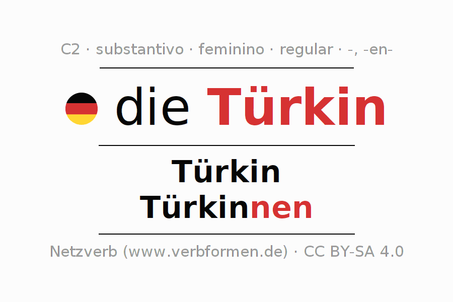 Declinação de Türkin é apresentada em uma tabela com todas as formas no singular e no plural (plural) e em todos os quatro casos: nominativo (1º caso), genitivo (2º caso), dativo (3º caso) e acusativo (4º caso) . Especialmente para os alunos de alemão, a correta declinação da palavra Türkin é fundamental.