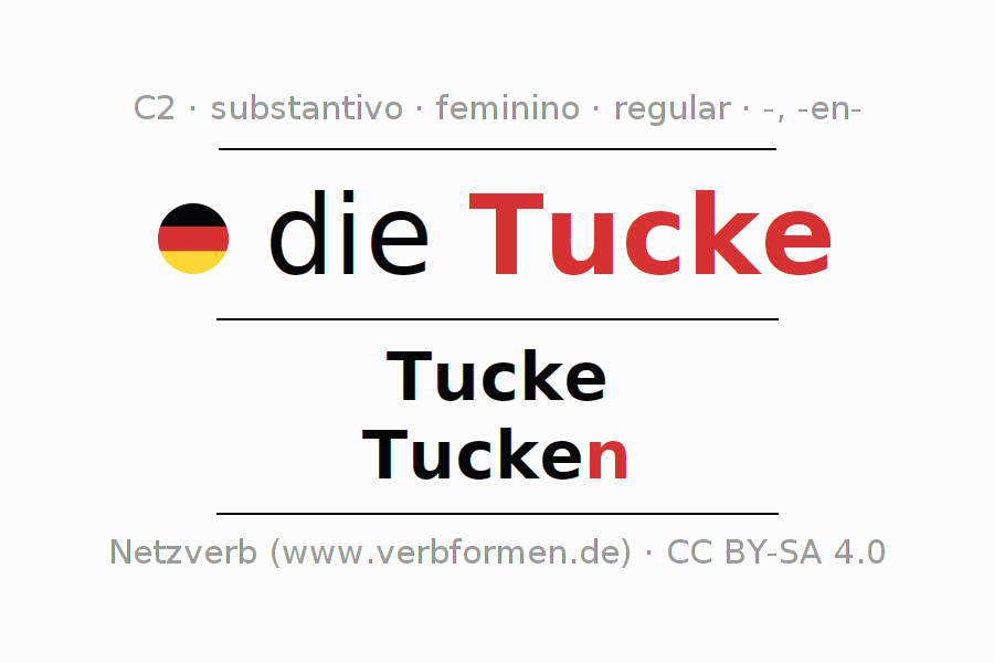 A declinação do substantivo Tucke (homossexual) está no genitivo singular Tucke e no nominativo plural Tucken . O substantivo fraco Tucke é declinado com a terminação -/n. O gênero gramatical de Tucke é feminino e o artigo definido é "die". Não se pode somente declinar o substantivo Tucke mas sim todos os substantivos em alemão. O substantivo faz parte do vocabulário referente ao Certificado em Alemão do Nível C2. Comentários ☆