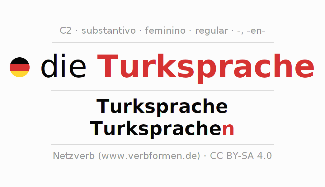 Declinação de Turksprache é apresentada em uma tabela com todas as formas no singular e no plural (plural) e em todos os quatro casos: nominativo (1º caso), genitivo (2º caso), dativo (3º caso) e acusativo (4º caso) . Especialmente para os alunos de alemão, a correta declinação da palavra Turksprache é fundamental.