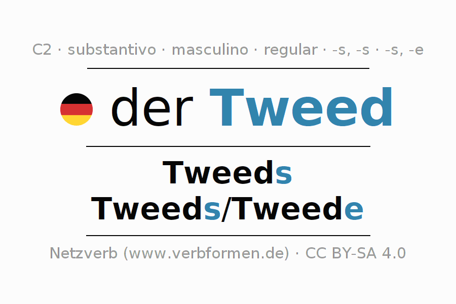 Declinação de Tweed é apresentada em uma tabela com todas as formas no singular e no plural (plural) e em todos os quatro casos: nominativo (1º caso), genitivo (2º caso), dativo (3º caso) e acusativo (4º caso) . Especialmente para os alunos de alemão, a correta declinação da palavra Tweed é fundamental.