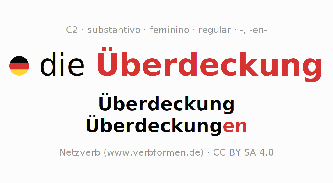 A declinação do substantivo Überdeckung (sobreposição, cobertura) está no genitivo singular Überdeckung e no nominativo plural Überdeckungen . O substantivo fraco Überdeckung é declinado com a terminação -/en. O gênero gramatical de Überdeckung é feminino e o artigo definido é "die". Não se pode somente declinar o substantivo Überdeckung mas sim todos os substantivos em alemão. O substantivo faz parte do vocabulário referente ao Certificado em Alemão do Nível C2. Comentários ☆