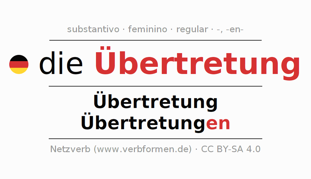A declinação do substantivo Übertretung (atropelo, contravenção) está no genitivo singular Übertretung e no nominativo plural Übertretungen . O substantivo fraco Übertretung é declinado com a terminação -/en. O gênero gramatical de Übertretung é feminino e o artigo definido é "die". Não se pode somente declinar o substantivo Übertretung mas sim todos os substantivos em alemão. Comentários ☆