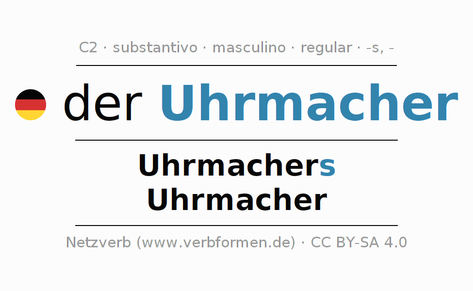 Declinação de Uhrmacher é apresentada em uma tabela com todas as formas no singular e no plural (plural) e em todos os quatro casos: nominativo (1º caso), genitivo (2º caso), dativo (3º caso) e acusativo (4º caso) . Especialmente para os alunos de alemão, a correta declinação da palavra Uhrmacher é fundamental.