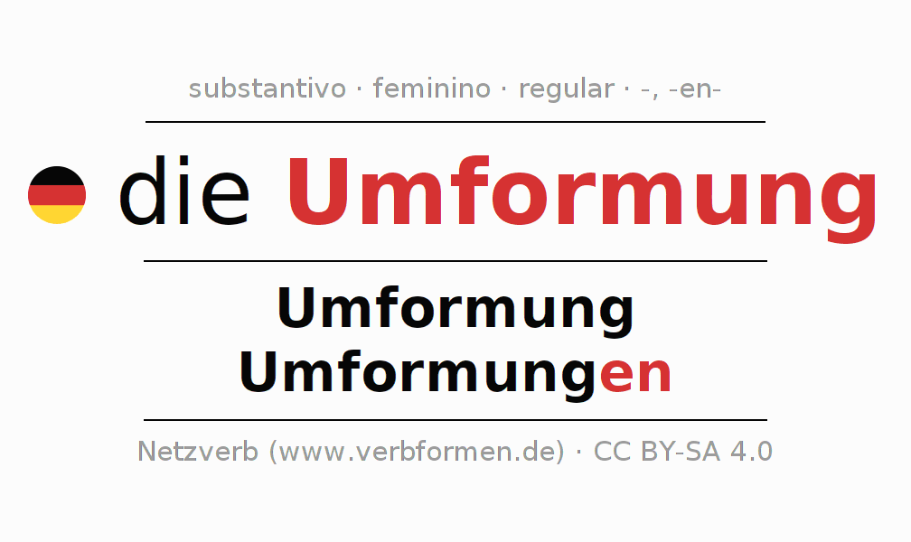 Declinação de Umformung é apresentada em uma tabela com todas as formas no singular e no plural (plural) e em todos os quatro casos: nominativo (1º caso), genitivo (2º caso), dativo (3º caso) e acusativo (4º caso) . Especialmente para os alunos de alemão, a correta declinação da palavra Umformung é fundamental.