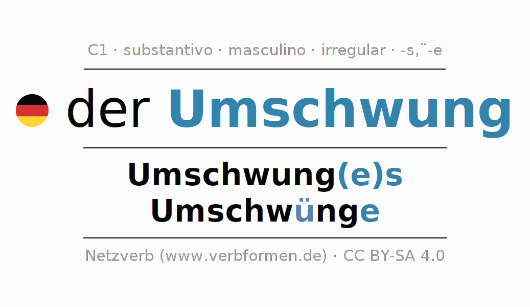 Declinação de Umschwung é apresentada em uma tabela com todas as formas no singular e no plural (plural) e em todos os quatro casos: nominativo (1º caso), genitivo (2º caso), dativo (3º caso) e acusativo (4º caso) . Especialmente para os alunos de alemão, a correta declinação da palavra Umschwung é fundamental.