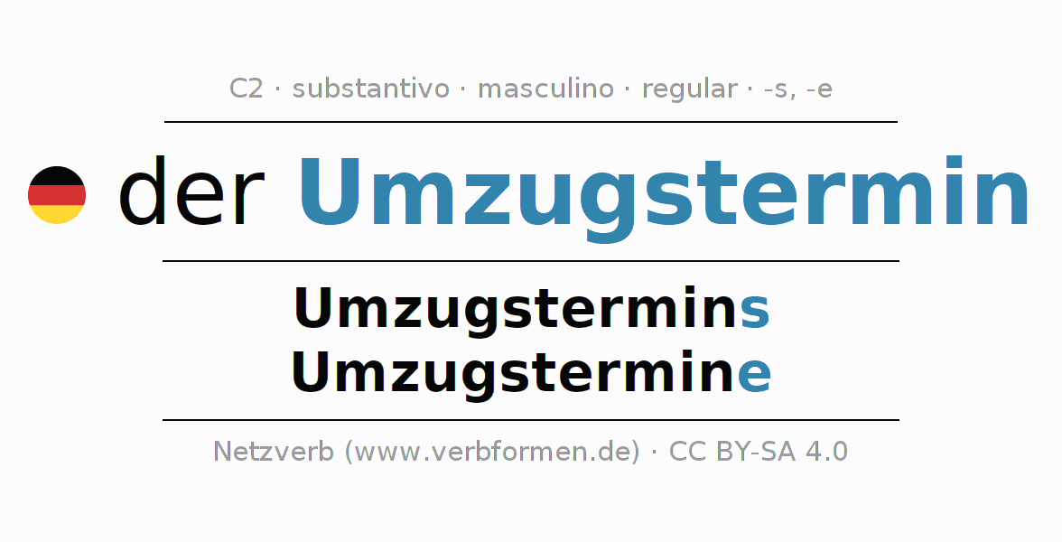 A declinação do substantivo Umzugstermin (data da mudança) está no genitivo singular Umzugstermins e no nominativo plural Umzugstermine . O substantivo forte Umzugstermin é declinado com a terminação s/e. O gênero gramatical de Umzugstermin é masculino e o artigo definido é 'der'. Não se pode somente declinar o substantivo Umzugstermin mas sim todos os substantivos em alemão. O substantivo faz parte do vocabulário referente ao Certificado em Alemão do Nível C2. Comentários ☆