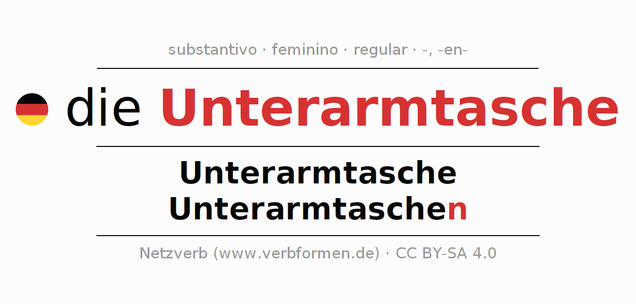 A declinação do substantivo Unterarmtasche (bolsa de axila, bolsa de braço) está no genitivo singular Unterarmtasche e no nominativo plural Unterarmtaschen . O substantivo fraco Unterarmtasche é declinado com a terminação -/n. O gênero gramatical de Unterarmtasche é feminino e o artigo definido é "die". Não se pode somente declinar o substantivo Unterarmtasche mas sim todos os substantivos em alemão. Comentários ☆