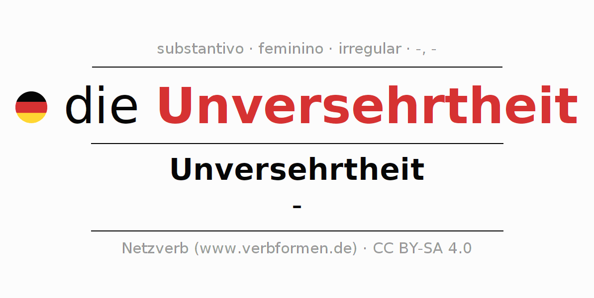 A declinação do substantivo Unversehrtheit (integridade, intactez) está no genitivo singular Unversehrtheit e no nominativo plural - . O substantivo Unversehrtheit é declinado com as terminações -/-. Não há formas no plural. O gênero gramatical de Unversehrtheit é feminino e o artigo definido é "die". Não se pode somente declinar o substantivo Unversehrtheit mas sim todos os substantivos em alemão. Comentários ☆