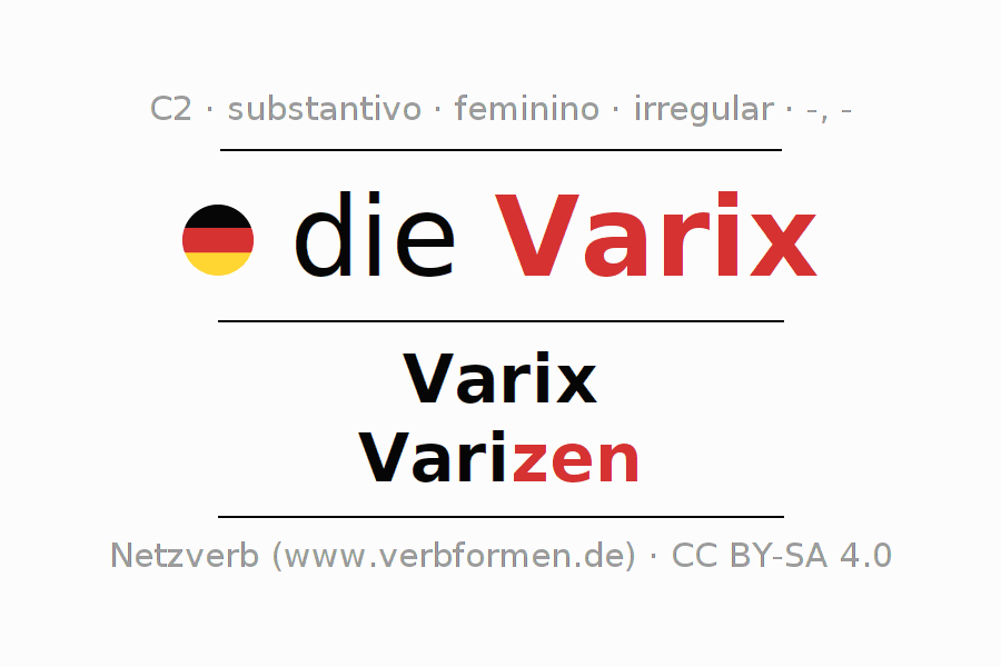 Declinação de Varix é apresentada em uma tabela com todas as formas no singular e no plural (plural) e em todos os quatro casos: nominativo (1º caso), genitivo (2º caso), dativo (3º caso) e acusativo (4º caso) . Especialmente para os alunos de alemão, a correta declinação da palavra Varix é fundamental.