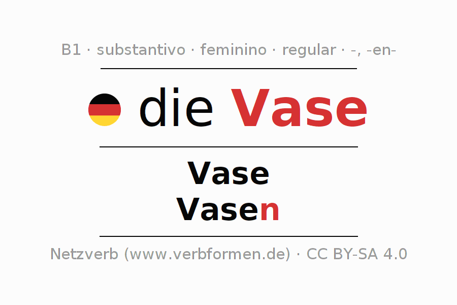 Declinação de Vase é apresentada em uma tabela com todas as formas no singular e no plural (plural) e em todos os quatro casos: nominativo (1º caso), genitivo (2º caso), dativo (3º caso) e acusativo (4º caso) . Especialmente para os alunos de alemão, a correta declinação da palavra Vase é fundamental.