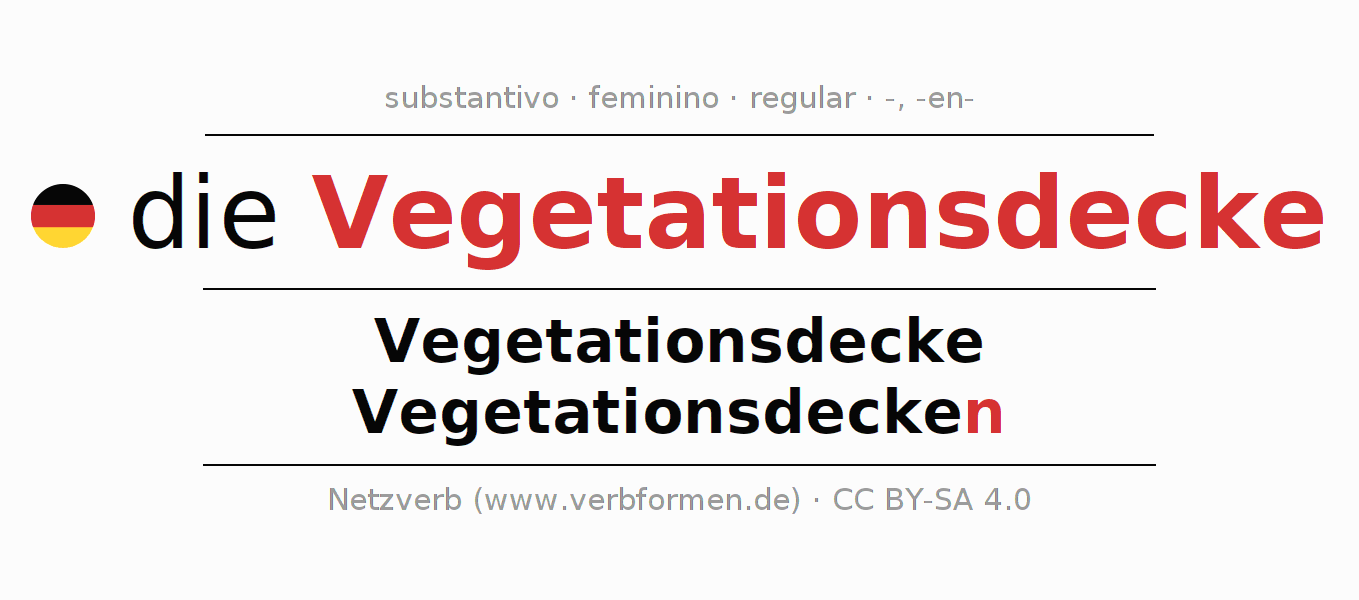 A declinação do substantivo Vegetationsdecke (cobertura vegetal) está no genitivo singular Vegetationsdecke e no nominativo plural Vegetationsdecken . O substantivo fraco Vegetationsdecke é declinado com a terminação -/n. O gênero gramatical de Vegetationsdecke é feminino e o artigo definido é "die". Não se pode somente declinar o substantivo Vegetationsdecke mas sim todos os substantivos em alemão. Comentários ☆