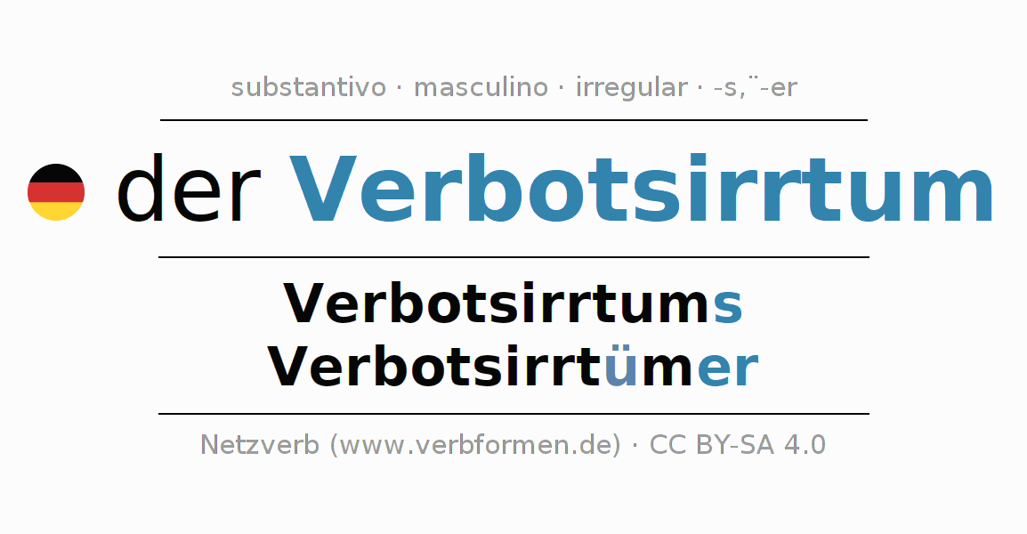 A declinação do substantivo Verbotsirrtum (erro sobre a proibição) está no genitivo singular Verbotsirrtums e no nominativo plural Verbotsirrtümer . O substantivo forte Verbotsirrtum é declinado com a terminação s/ü-er. No plural com um trema. O gênero gramatical de Verbotsirrtum é masculino e o artigo definido é 'der'. Não se pode somente declinar o substantivo Verbotsirrtum mas sim todos os substantivos em alemão. Comentários ☆