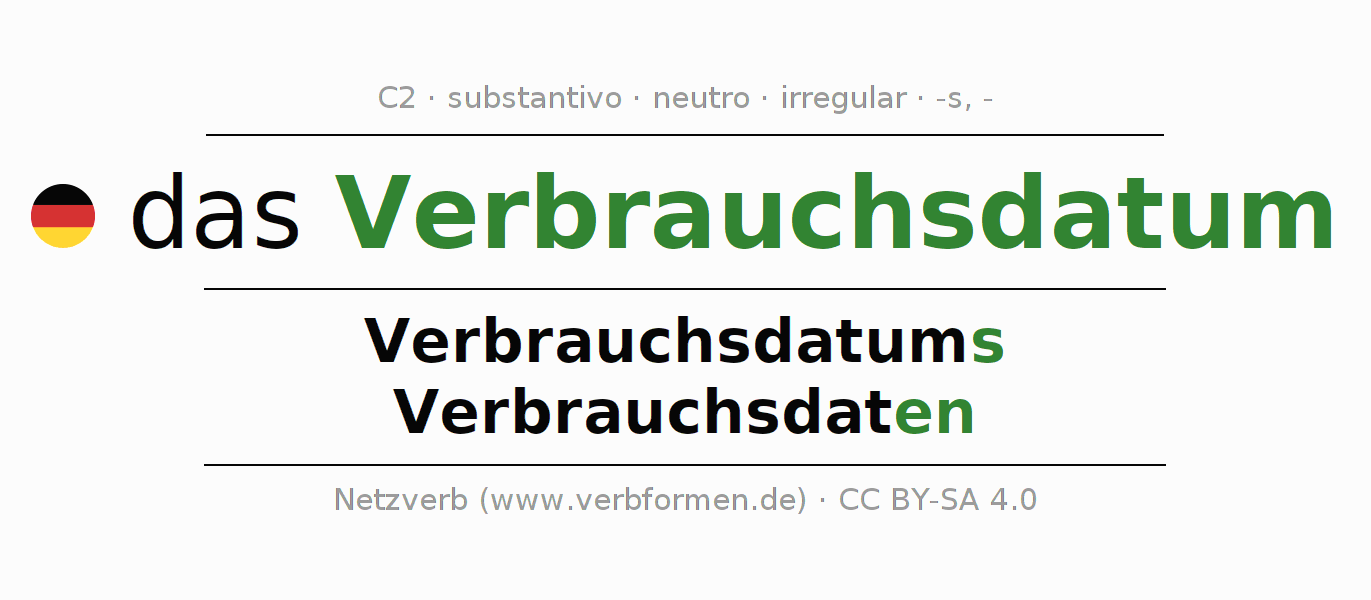 A declinação do substantivo Verbrauchsdatum (data de validade) está no genitivo singular Verbrauchsdatums e no nominativo plural Verbrauchsdaten . O substantivo Verbrauchsdatum é declinado com as terminações s/en. O gênero gramatical de Verbrauchsdatum é neutro e o artigo definido é "das". Não se pode somente declinar o substantivo Verbrauchsdatum mas sim todos os substantivos em alemão. O substantivo faz parte do vocabulário referente ao Certificado em Alemão do Nível C2. Comentários ☆