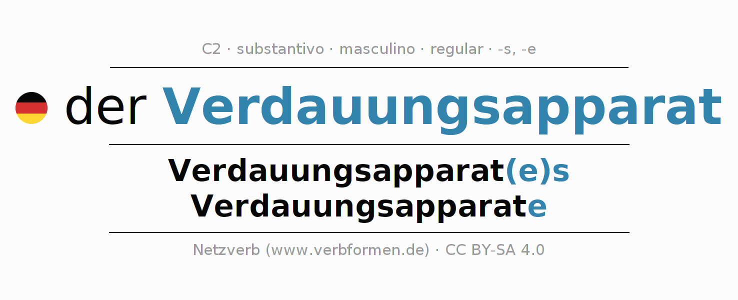 - Singular: der Verdauungsapparat, des Verdauungsapparat(e)s, dem Verdauungsapparat(e), den Verdauungsapparat