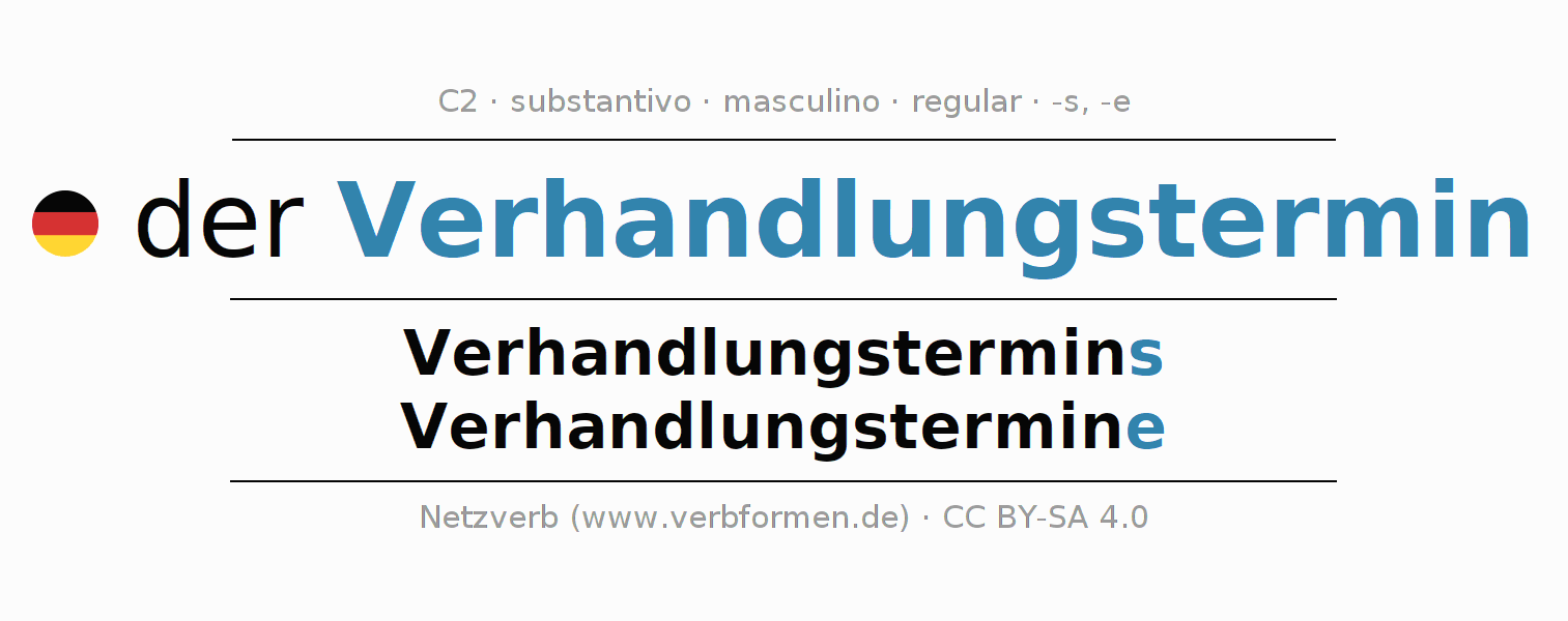 Declinação de Verhandlungstermin é apresentada em uma tabela com todas as formas no singular e no plural (plural) e em todos os quatro casos: nominativo (1º caso), genitivo (2º caso), dativo (3º caso) e acusativo (4º caso) . Especialmente para os alunos de alemão, a correta declinação da palavra Verhandlungstermin é fundamental.