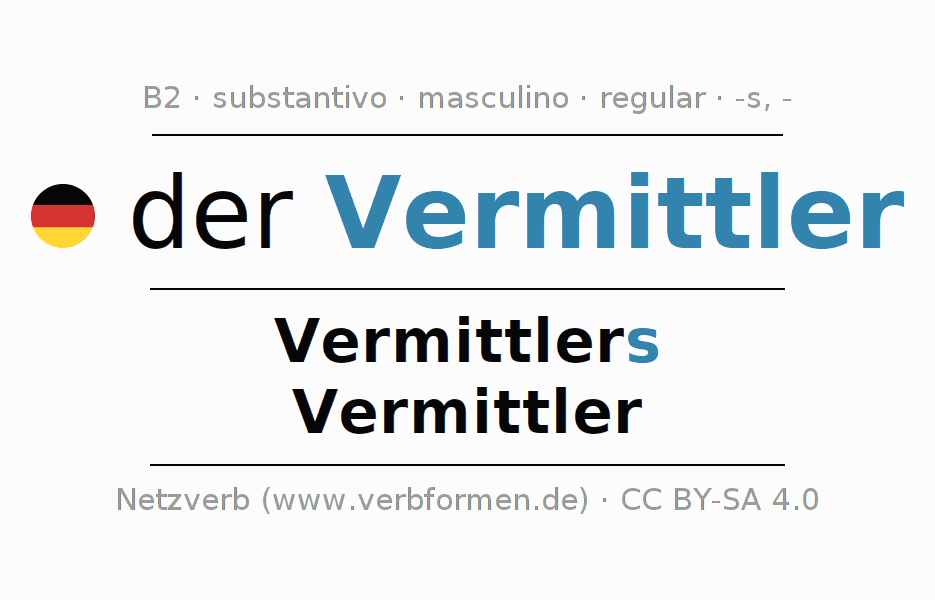 Declinação de Vermittler é apresentada em uma tabela com todas as formas no singular e no plural (plural) e em todos os quatro casos: nominativo (1º caso), genitivo (2º caso), dativo (3º caso) e acusativo (4º caso) . Especialmente para os alunos de alemão, a correta declinação da palavra Vermittler é fundamental.