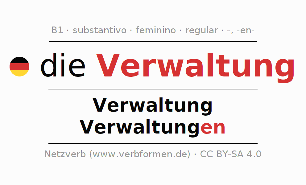 Declinação de Verwaltung é apresentada em uma tabela com todas as formas no singular e no plural (plural) e em todos os quatro casos: nominativo (1º caso), genitivo (2º caso), dativo (3º caso) e acusativo (4º caso) . Especialmente para os alunos de alemão, a correta declinação da palavra Verwaltung é fundamental.