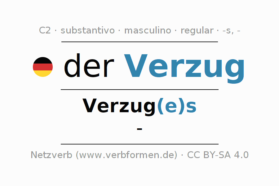 A declinação do substantivo Verzug (atraso, demora) está no genitivo singular Verzug(e)s e no nominativo plural - . O substantivo forte Verzug é declinado com a terminação es/-. Não há formas no plural. O gênero gramatical de Verzug é masculino e o artigo definido é 'der'. Não se pode somente declinar o substantivo Verzug mas sim todos os substantivos em alemão. O substantivo faz parte do vocabulário referente ao Certificado em Alemão do Nível C2. Comentários ☆