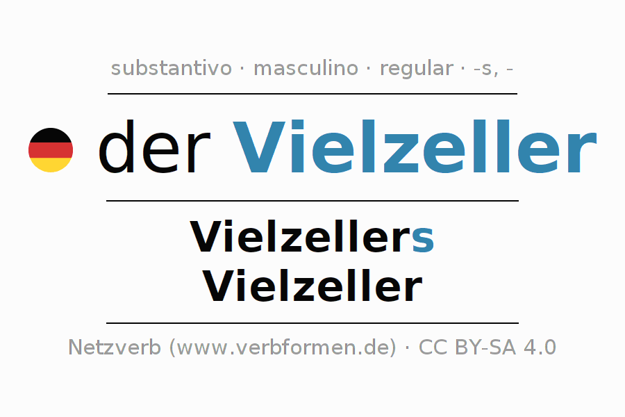 Declinação de Vielzeller é apresentada em uma tabela com todas as formas no singular e no plural (plural) e em todos os quatro casos: nominativo (1º caso), genitivo (2º caso), dativo (3º caso) e acusativo (4º caso) . Especialmente para os alunos de alemão, a correta declinação da palavra Vielzeller é fundamental.