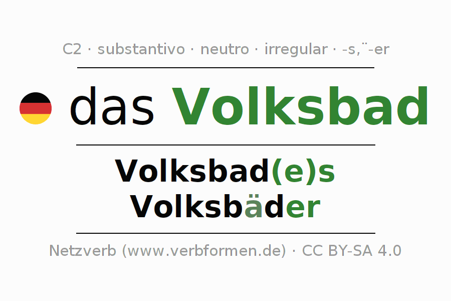 A declinação do substantivo Volksbad (banho público) está no genitivo singular Volksbad(e)s e no nominativo plural Volksbäder . O substantivo forte Volksbad é declinado com a terminação es/ä-er. No plural com um trema. O gênero gramatical de Volksbad é neutro e o artigo definido é "das". Não se pode somente declinar o substantivo Volksbad mas sim todos os substantivos em alemão. O substantivo faz parte do vocabulário referente ao Certificado em Alemão do Nível C2. Comentários ☆