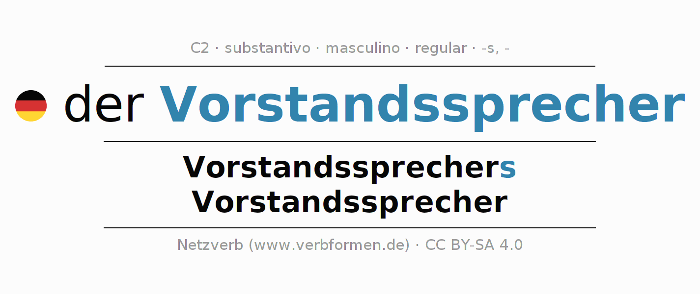 A declinação do substantivo Vorstandssprecher (porta-voz, representante) está no genitivo singular Vorstandssprechers e no nominativo plural Vorstandssprecher . O substantivo forte Vorstandssprecher é declinado com a terminação s/-. O gênero gramatical de Vorstandssprecher é masculino e o artigo definido é 'der'. Não se pode somente declinar o substantivo Vorstandssprecher mas sim todos os substantivos em alemão. O substantivo faz parte do vocabulário referente ao Certificado em Alemão do Nível C2. Comentários ☆