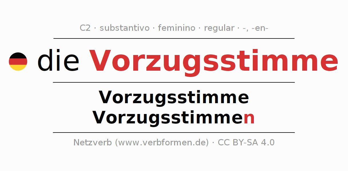 Declinação de Vorzugsstimme é apresentada em uma tabela com todas as formas no singular e no plural (plural) e em todos os quatro casos: nominativo (1º caso), genitivo (2º caso), dativo (3º caso) e acusativo (4º caso) . Especialmente para os alunos de alemão, a correta declinação da palavra Vorzugsstimme é fundamental.