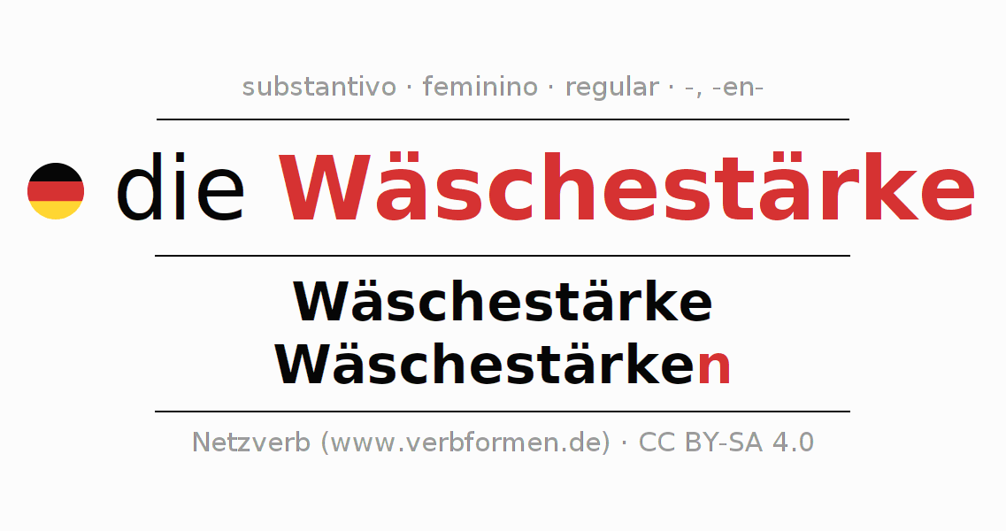 A declinação do substantivo Wäschestärke (amido de lavanderia) está no genitivo singular Wäschestärke e no nominativo plural Wäschestärken . O substantivo fraco Wäschestärke é declinado com a terminação -/n. O gênero gramatical de Wäschestärke é feminino e o artigo definido é "die". Não se pode somente declinar o substantivo Wäschestärke mas sim todos os substantivos em alemão. Comentários ☆