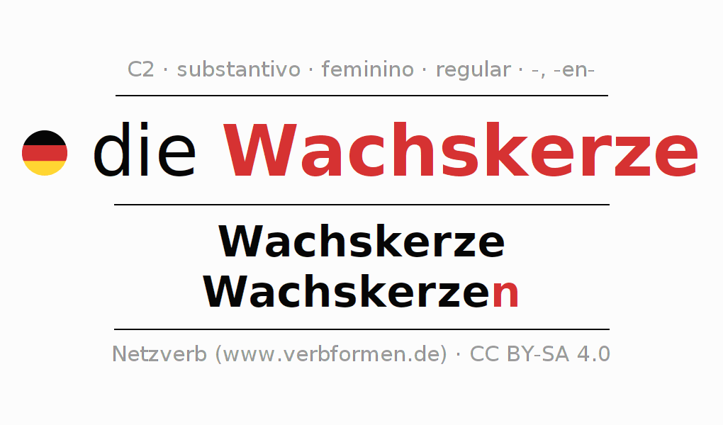 A declinação do substantivo Wachskerze (vela) está no genitivo singular Wachskerze e no nominativo plural Wachskerzen . O substantivo fraco Wachskerze é declinado com a terminação -/n. O gênero gramatical de Wachskerze é feminino e o artigo definido é "die". Não se pode somente declinar o substantivo Wachskerze mas sim todos os substantivos em alemão. O substantivo faz parte do vocabulário referente ao Certificado em Alemão do Nível C2. Comentários ☆