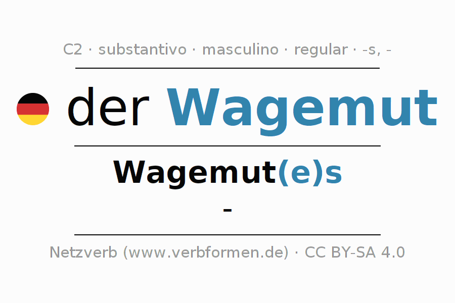 A declinação do substantivo Wagemut (audácia, coragem) está no genitivo singular Wagemut(e)s e no nominativo plural - . O substantivo forte Wagemut é declinado com a terminação es/-. Não há formas no plural. O gênero gramatical de Wagemut é masculino e o artigo definido é 'der'. Não se pode somente declinar o substantivo Wagemut mas sim todos os substantivos em alemão. O substantivo faz parte do vocabulário referente ao Certificado em Alemão do Nível C2. Comentários ☆