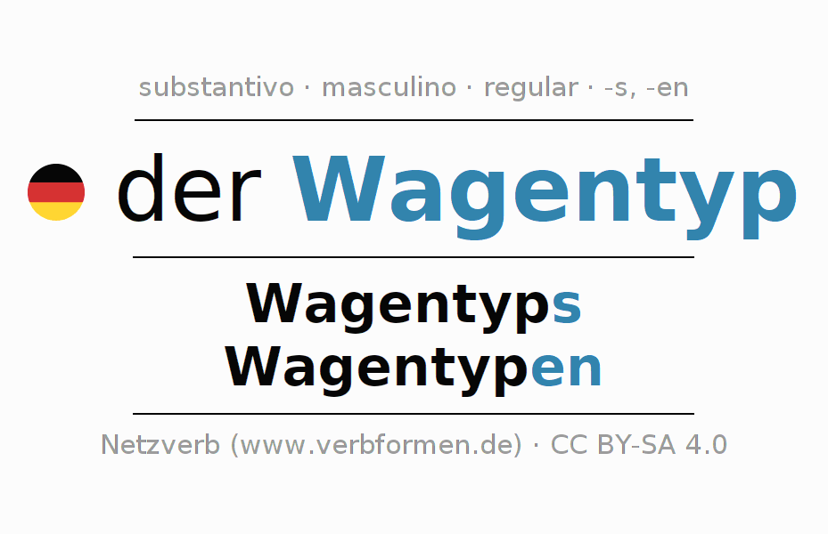 A declinação do substantivo Wagentyp (tipo de veículo) está no genitivo singular Wagentyps e no nominativo plural Wagentypen . O substantivo misto Wagentyp é declinado com a terminação s/en. O gênero gramatical de Wagentyp é masculino e o artigo definido é 'der'. Não se pode somente declinar o substantivo Wagentyp mas sim todos os substantivos em alemão. Comentários ☆