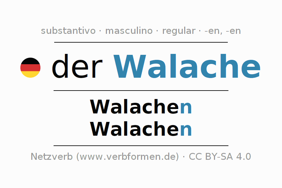 A declinação do substantivo Walache está no genitivo singular Walachen e no nominativo plural Walachen . O substantivo fraco Walache é declinado com a terminação n/n. O gênero gramatical de Walache é masculino e o artigo definido é 'der'. Não se pode somente declinar o substantivo Walache mas sim todos os substantivos em alemão. Comentários ☆