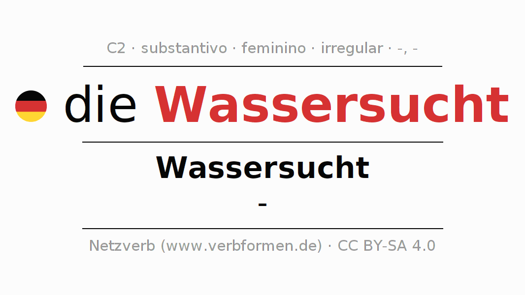 A declinação do substantivo Wassersucht (hidropisia, acúmulo de água) está no genitivo singular Wassersucht e no nominativo plural - . O substantivo Wassersucht é declinado com as terminações -/-. Não há formas no plural. O gênero gramatical de Wassersucht é feminino e o artigo definido é "die". Não se pode somente declinar o substantivo Wassersucht mas sim todos os substantivos em alemão. O substantivo faz parte do vocabulário referente ao Certificado em Alemão do Nível C2. Comentários ☆
