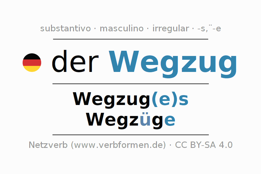 A declinação do substantivo Wegzug (mudança) está no genitivo singular Wegzug(e)s e no nominativo plural Wegzüge . O substantivo forte Wegzug é declinado com a terminação es/ü-e. No plural com um trema. O gênero gramatical de Wegzug é masculino e o artigo definido é 'der'. Não se pode somente declinar o substantivo Wegzug mas sim todos os substantivos em alemão. Comentários ☆
