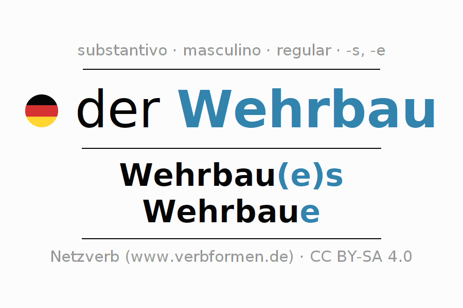 Declinação de Wehrbau é apresentada em uma tabela com todas as formas no singular e no plural (plural) e em todos os quatro casos: nominativo (1º caso), genitivo (2º caso), dativo (3º caso) e acusativo (4º caso) . Especialmente para os alunos de alemão, a correta declinação da palavra Wehrbau é fundamental.